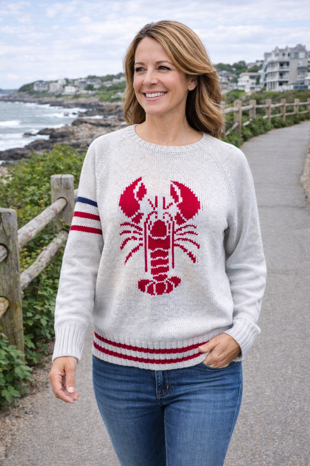 The sweater features a soft, light neutral base—best described as a heathered ivory or light stone color—which gives it a relaxed, easy-to-wear look. The standout design is the bold red lobster graphic centered on the front, knit directly into the fabric for a textured, high-quality finish that feels both playful and distinctly New England.