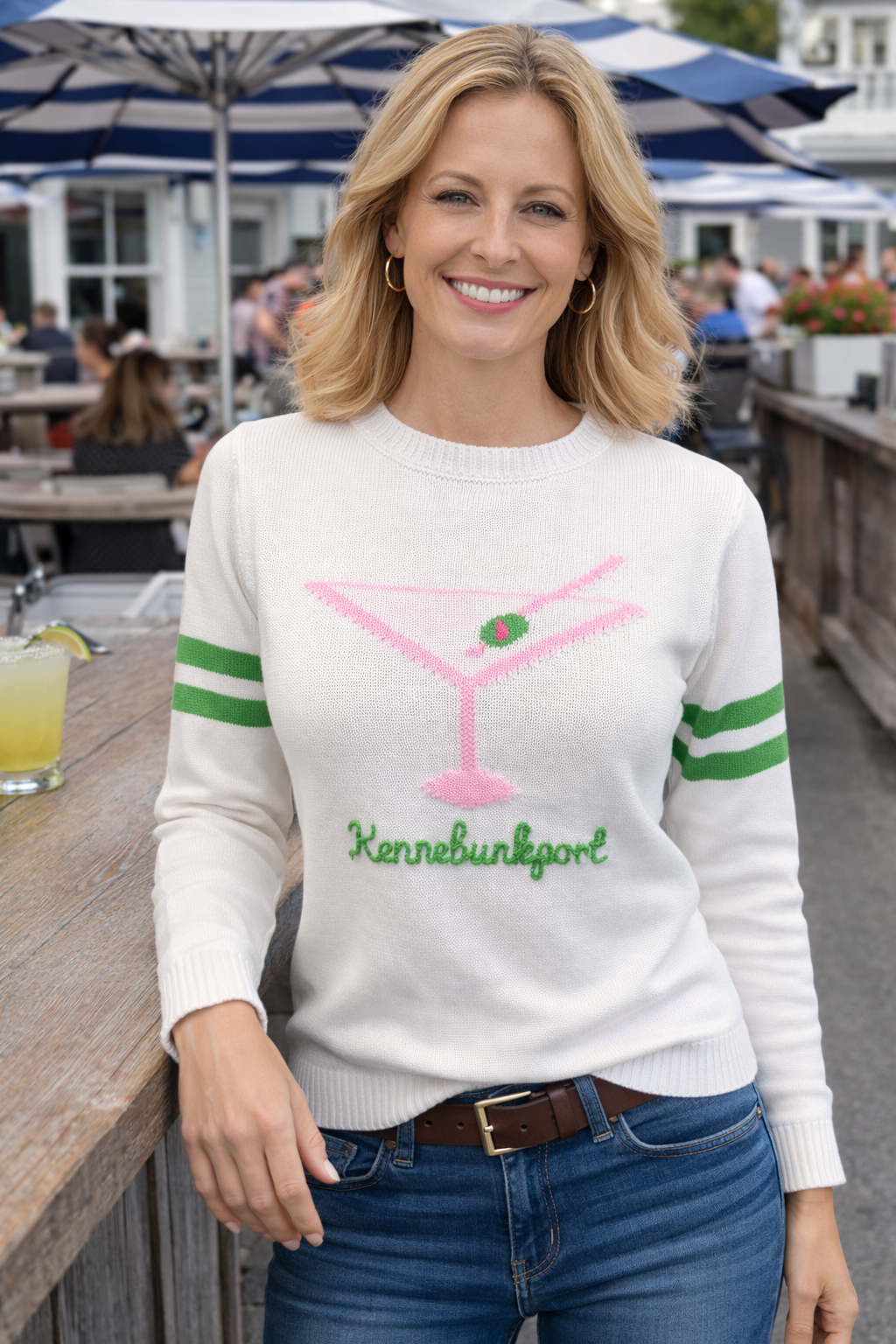 This Pink Pineapple sweater is a fun, coastal-lifestyle knit that blends preppy styling with a playful cocktail theme. Crafted from 100% cotton, this sweater has a soft, breathable knit that’s ideal for year-round wear, especially in coastal climates. It features a clean ivory base that keeps the look crisp and versatile, while the standout detail is the large martini glass graphic across the chest, accented with a pop of color for a lighthearted, social vibe.