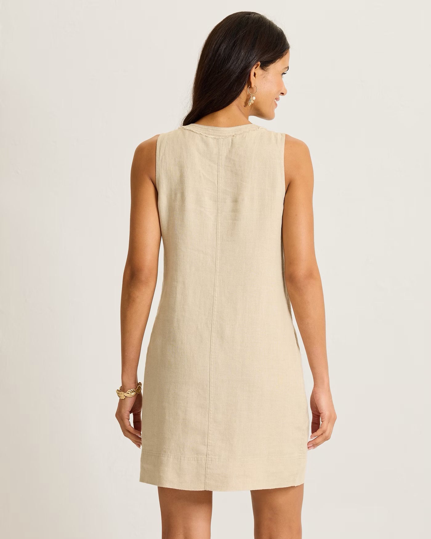 The airy Two Palms linen is back in a new dress silhouette that's perfect for any warm-weather getaway. Featuring a chic scoop neckline and an effortlessly body-skimming drape, it's an easy throw-on style that flatters everybody and always looks elegant. Trend-right patch pockets, raw-edge hems, and decorative trapunto stitching add another element of elevated ease.