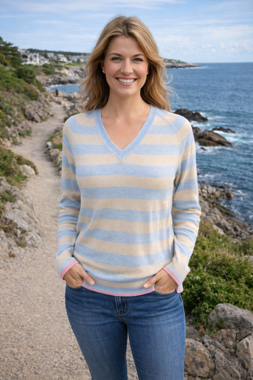 Zaket & Plover combines whimsy and color into every luxury knit they create. The Stripe V Sweater is the perfect meeting of soft striping with bold contrast color trim. Relaxed and comfortable in a soft cotton blend with a touch of silk to keep it lightweight for the warmer months.