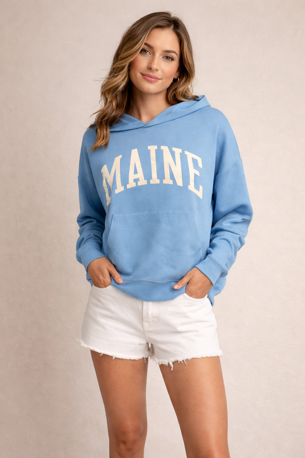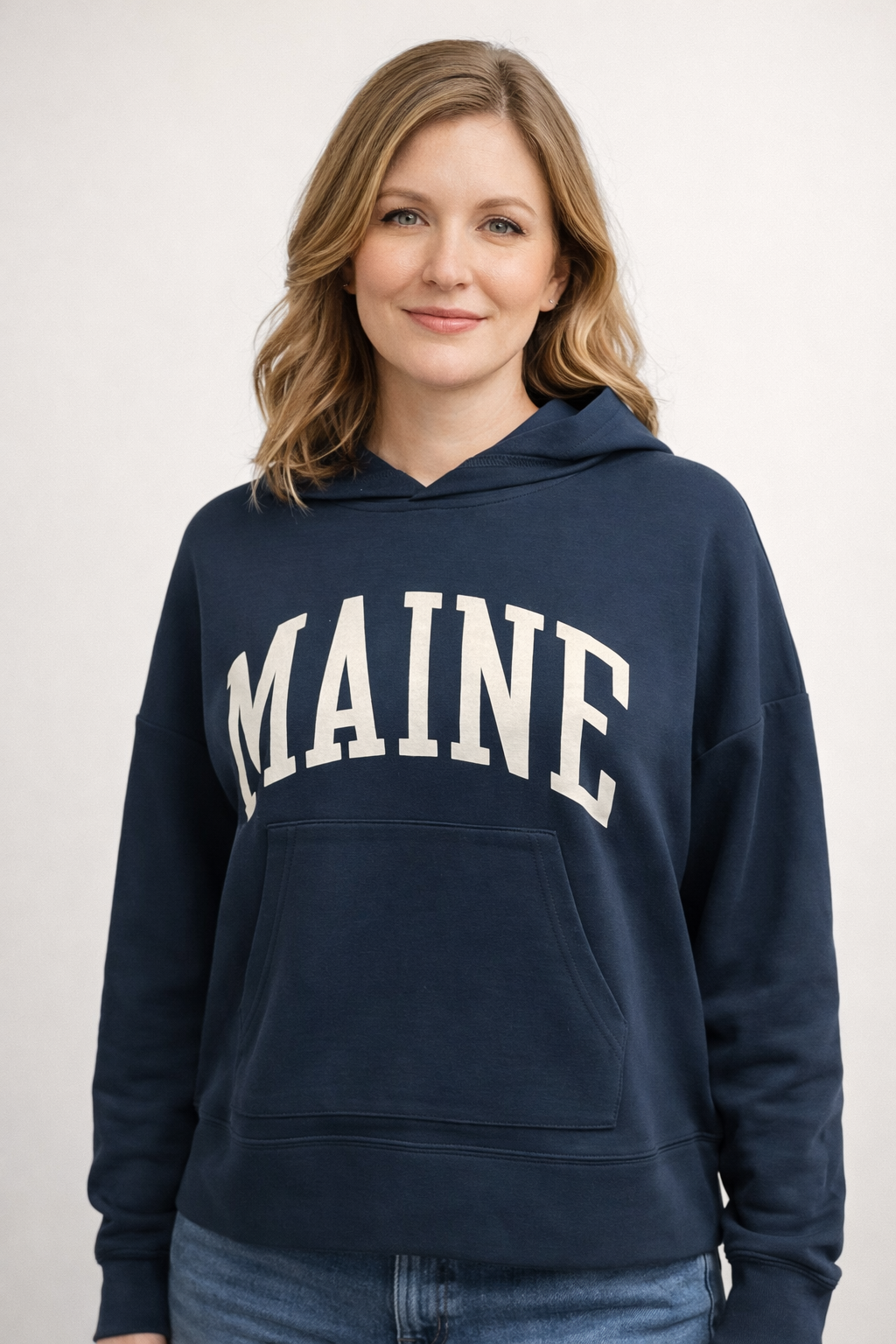 This comfortable and easygoing women’s hoodie features a soft synthetic fabric with a smooth, clean finish that’s perfect for everyday wear. Designed with a relaxed, casual silhouette, it showcases bold “MAINE” lettering across the front for a classic coastal look. The self-fabric construction at the collar, cuffs, waistband, and kangaroo pocket creates a streamlined, cohesive feel while enhancing comfort and durability. Ideal for layering on cool coastal mornings, casual outings, or lounging in laid-back style.