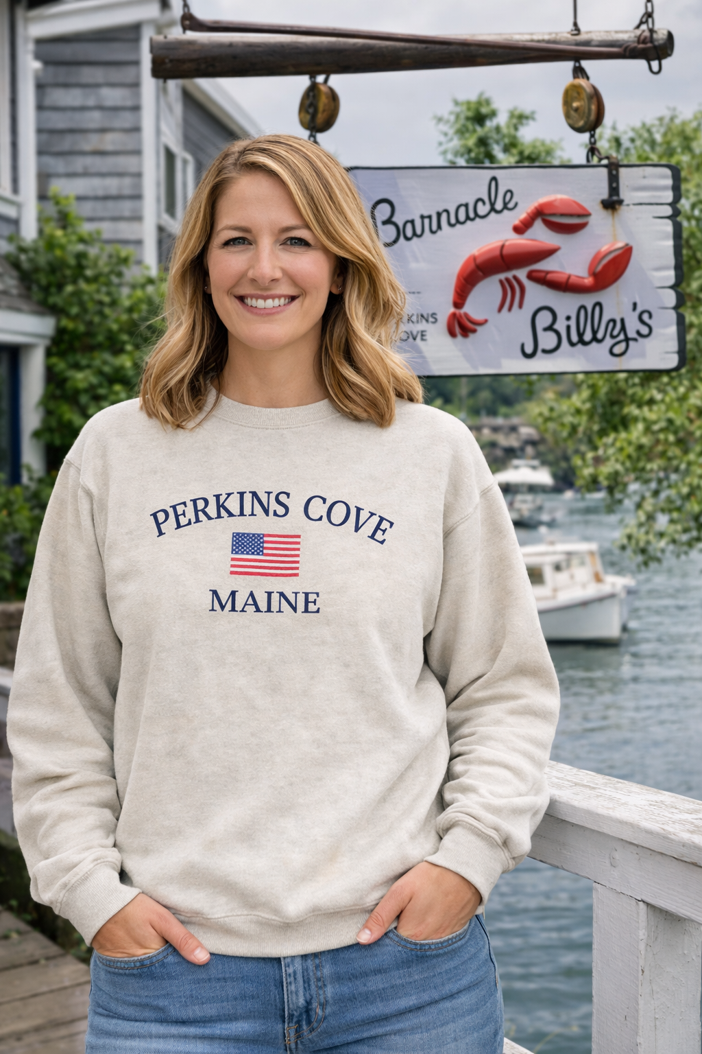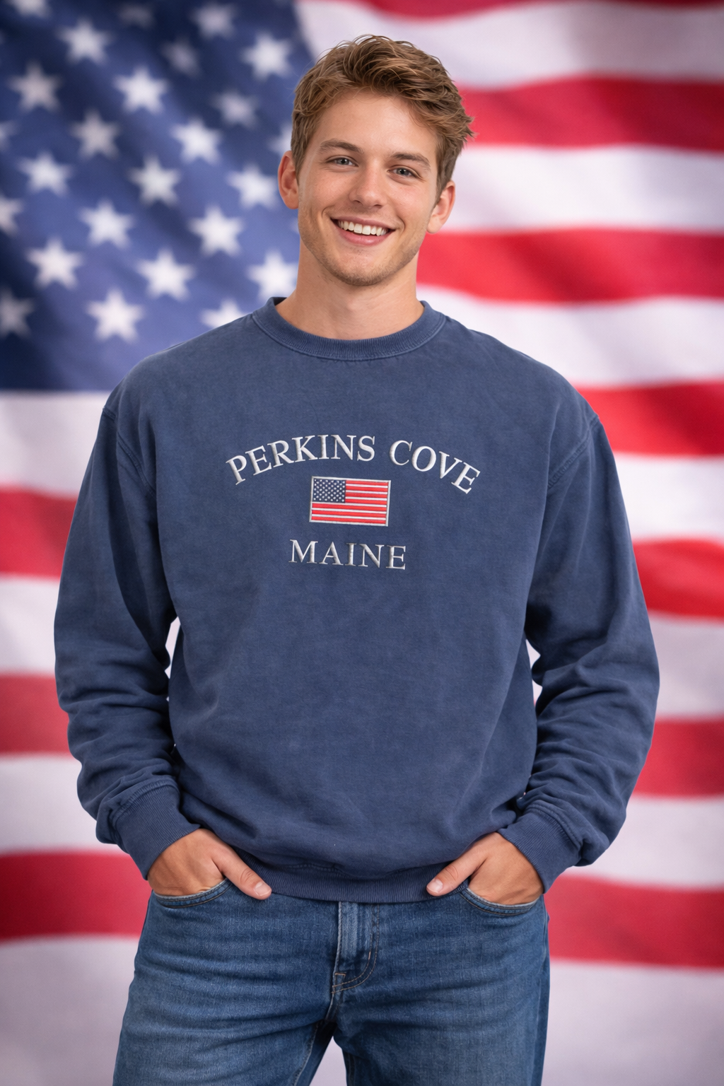 Celebrate our Nation's 250th with our Perkins Cove USA Flag Crewneck Embroidered Sweatshirt. Designed for everyday comfort, this classic pullover features a timeless arched “Perkins Cove Maine” graphic with an American Flag, giving it a relaxed, coastal look that’s perfect year-round. The soft cotton-blend fabric offers the ideal balance of comfort and durability, making it great for cool evenings by the water, casual days in town, or layering through the seasons.
