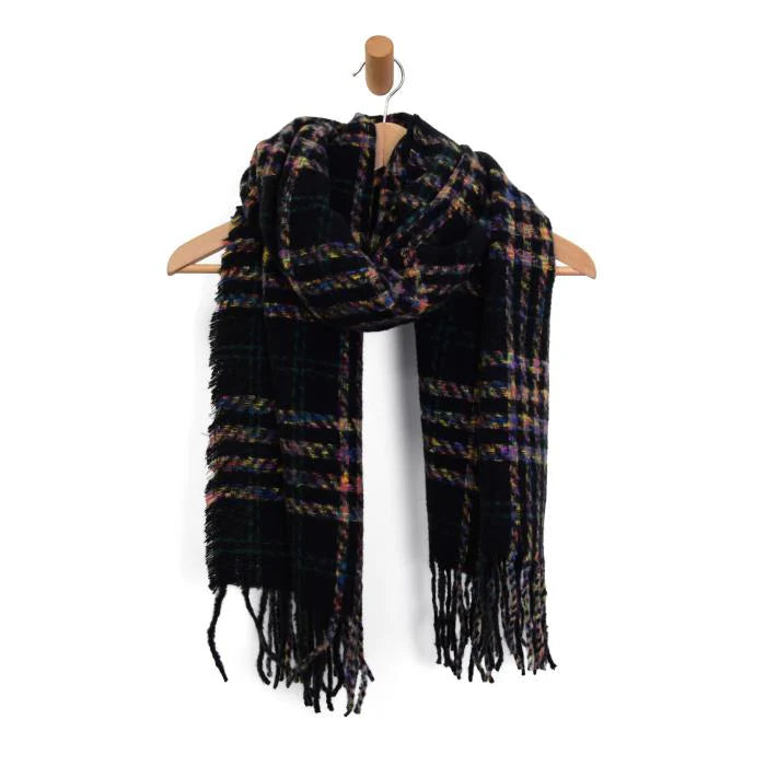 Add a dash of fun and warmth to your wardrobe with the Black Prismatic Plaid Fringe Scarf. This cozy scarf features a vibrant plaid pattern that playfully blends classic style with a modern twist. The soft material wraps you in comfort, while the fringed edges add a touch of flirty movement. Perfect for chilly days or to brighten up a simple outfit, this scarf is your go-to accessory for staying snug and stylish with a spirited edge.